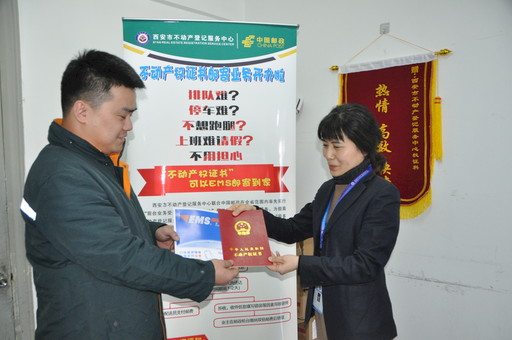 自11月29日起,陜西省西安市不動產(chǎn)登記服務(wù)中心正式受理群眾的不動產(chǎn)權(quán)證書郵寄業(yè)務(wù),群眾在辦理二手房交易、房屋抵押注銷、權(quán)屬登記等業(yè)務(wù)時可提出郵寄服務(wù)申請,證書制作完成后可由EMS送達。這是西安市郵政寄遞事業(yè)部切入政府便民惠民工作、實現(xiàn)郵政便民服務(wù)的又一次拓展。圖為西安市不動產(chǎn)登記服務(wù)中心的工作人員將第一件要郵寄的證書交到EMS工作人員手中。 □張雪珂 攝影報道