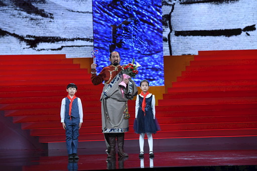 其美多吉舉起“2018年度感動中國人物”獎杯。記者  朱正義  攝