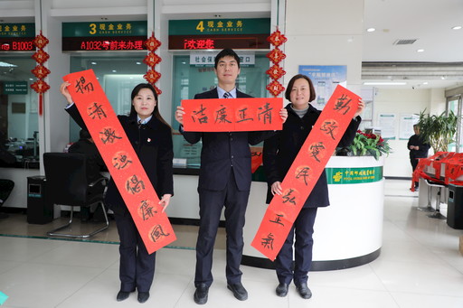 日前,郵儲銀行河南省開封市分行紀委分派紀檢監察人員到各支行網點進行檢查并送去廉潔春聯。該分行紀委強調節日期間各單位要深入貫徹落實中央八項規定精神,持之以恒正風肅紀,嚴防“四風”問題反彈回潮。通過送廉政春聯提醒廣大干部職工在節日期間要廉潔自律。圖為濱河路支行員工展示廉潔春聯。 □魏慧敏 攝影報道