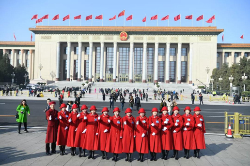 她們今天每個人都不約而同地選擇了紅色上衣,和人民大會堂、天安門廣場上的紅旗相互映襯,紅色是今天的主題,這紅是不斷涌動的紅,這紅是希望的紅。