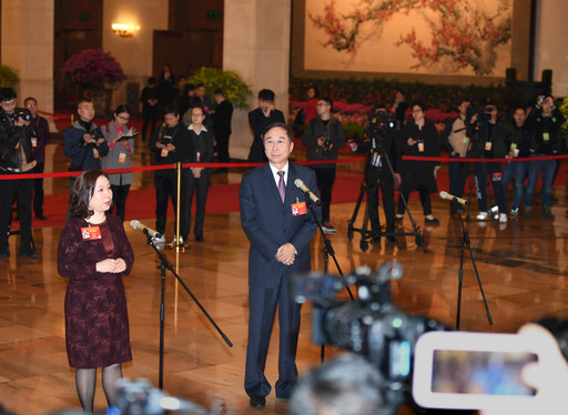 今年兩會共舉行四場“部長通道”集中采訪活動,34位部長回答了66位記者和網友提出的89個問題,圖為生態環境部部長李干杰(左)在部長通道上提出污染防治要聚焦打好七場戰役。