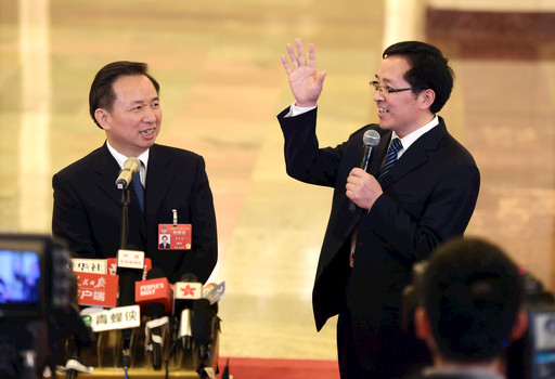 今年全國政協會議共舉辦了三次“委員通道”集體采訪活動,圖為全國政協委員劉月寧(左)、馮鞏(右)在“委員通道”接受采訪。