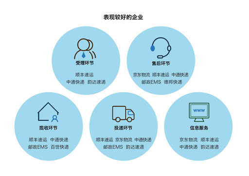 4月24日,國(guó)家郵政局發(fā)布了關(guān)于2019年第一季度快遞服務(wù)滿(mǎn)意度調(diào)查和時(shí)限準(zhǔn)時(shí)率測(cè)試結(jié)果的通告,在快遞企業(yè)公眾滿(mǎn)意度方面,得分在80分以上的企業(yè)為順豐速運(yùn)、京東物流,得分在76-80分之間的企業(yè)為郵政EMS、中通快遞、韻達(dá)速遞、申通快遞、圓通速遞和百世快遞。(見(jiàn)圖表3)在此之前,國(guó)家郵政局發(fā)布2018年快遞服務(wù)用戶(hù)滿(mǎn)意度、時(shí)限準(zhǔn)時(shí)率調(diào)查結(jié)果。快遞企業(yè)總體滿(mǎn)意度排名依次為:順豐速運(yùn)、郵政EMS、京東物流、中通快遞、韻達(dá)速遞、圓通速遞、百世快遞、申通快遞、德邦快遞、優(yōu)速快遞。在受理環(huán)節(jié)表現(xiàn)較好的企業(yè)有:順豐速運(yùn)、中通快遞和韻達(dá)速遞;在攬收環(huán)節(jié)表現(xiàn)較好的企業(yè)有:順豐速運(yùn)、中通快遞、郵政EMS、百世快遞;投遞環(huán)節(jié)表現(xiàn)較好的企業(yè)有:順豐速運(yùn)、京東物流、中通快遞、郵政EMS、韻達(dá)速遞;售后環(huán)節(jié)表現(xiàn)較好的企業(yè)有:京東物流、順豐速運(yùn)、中通快遞、郵政EMS和德邦快遞。信息服務(wù)方面表現(xiàn)較好的企業(yè)有:京東物流、順豐速運(yùn)、中通快遞、韻達(dá)速遞。(見(jiàn)圖表4)