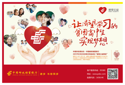 2017年,郵儲銀行向“郵愛公益基金”捐資500萬元,加上郵儲銀行員工和社會大眾的捐款,2017年“郵愛公益基金”累計募資1100多萬元。截至2018年末,“郵愛公益基金”已累計募資2000余萬元,幫助2400多名高中生實現成才夢想。