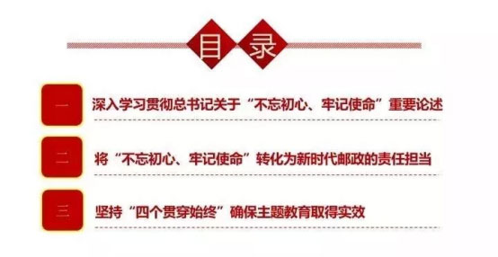 習近平總書記在“不忘初心、牢記使命”主題教育工作會議上深刻闡述了開展主題教育的重大意義、根本任務、目標要求和重點措施。廣大郵政黨員干部要進一步用習近平新時代中國特色社會主義思想武裝頭腦,指導實踐,緊扣郵政初心使命,緊密結合工作實際,將初心使命轉化為強烈的政治自覺、思想自覺和行動自覺,堅持質量第一、效益優先,推動企業高質量發展,把中國郵政打造成為行業“國家隊”。