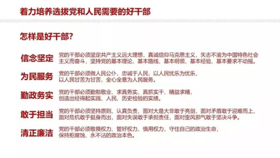 習近平總書記強調,好干部的標準,大的方面說,就是德才兼備。同時,好干部的標準又是具體的、歷史的。不同歷史時期,對干部德才的具體要求有所不同。