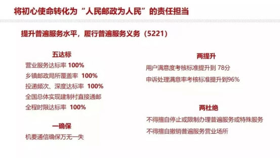 針對中央巡視指出的我們存在“無視、忽視、輕視、漠視”普遍服務的問題,普遍服務責任落實有差距,普遍服務質量管控有差距,普遍服務質量信息化支撐有差距,普遍服務網絡效能有差距,我們要努力提升普遍服務水平,履行普遍服務義務,實現“5221”目標。