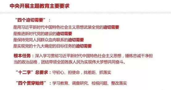 開展這次主題教育,就是要堅持思想建黨、理論強黨,堅持學思用貫通、知信行統一,推動廣大黨員干部不斷增強“四個意識”、堅定“四個自信”,堅決做到“兩個維護”,最關鍵的是堅決維護習近平總書記黨中央的核心、全黨的核心地位,做到“三個體現在”:體現在與黨中央保持高度一致上,體現在嚴守黨的政治紀律和政治規矩上,體現在堅決貫徹落實黨中央重大決策部署上。