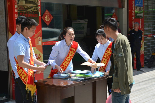 蔡里吉(中)組織支行員工積極宣傳金融知識。
