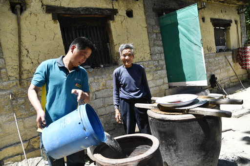 在董如德老人家里,孫吉剛掀起身旁的水缸蓋子看了看,發現缸里的水已經不多,自然地提起一旁的水桶,到附近水井里提了兩桶水上來。