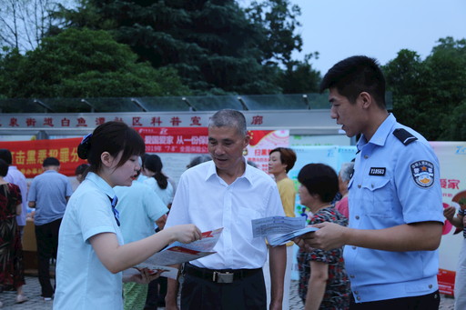 7月8日,由浙江省湖州市吳興區掃黑辦、區公安分局聯合市郵政分公司開展的掃黑除惡進村入社暨防詐騙熱線宣傳活動在龍泉街道白魚潭社區啟動。該活動通過現場宣傳和文藝表演的方式向廣大社區居民宣講掃黑除惡知識,解答防詐騙熱線的功能和作用。活動中,快板說唱、舞蹈、有獎問答等寓教于樂的節目受到群眾的熱烈歡迎。