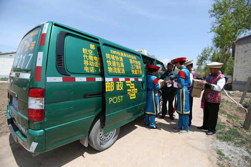 青海省互助土族自治縣郵政分公司投遞員為土族群眾投遞郵件。