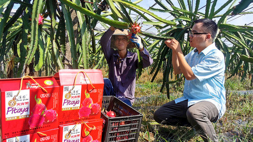 針對“919電商節”,浙江省瑞安市郵政分公司馬嶼營業部員工提前走訪火龍果種植戶,將火龍果引入郵政電商平臺,幫助農戶銷售。郵政員工還協助農戶進行火龍果采摘、裝箱、稱重、裝車工作,為火龍果線上銷售、線下寄遞打通“綠色通道”。截至9月15日,瑞安市分公司已“銷售+寄遞”火龍果3000件。圖為郵政員工在果園協助農戶采摘火龍果。 □狄瑤  攝影報道