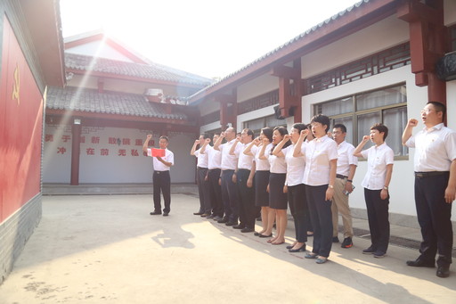 山東省分行黨員干部在山東原山艱苦創業教育基地重溫入黨誓詞。