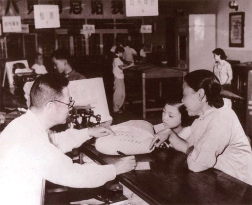 1958 年,東四郵局主動改善服務(wù),資深營業(yè)員于洪澤(左一),是在舊中華郵政工作過22 年的郵務(wù)佐,深信不能替用戶寫字的老規(guī)矩沒有錯,經(jīng)過服務(wù)思想教育,他告別了以前的自己,主動為用戶填寫單式。