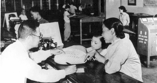1958年,東四郵局沖破思想的藩籬,在全行業(yè)率先做到“從臺后到臺前”,為用戶提供服務(wù)。圖為東四郵局老“郵務(wù)佐”于洪澤(左一),主動轉(zhuǎn)變思想,帶領(lǐng)大家走出柜臺為用戶填寫單據(jù)。 (資料圖片)