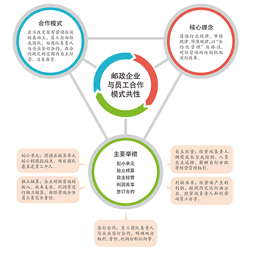 浙江義烏郵政的“準(zhǔn)加盟”制、云南郵政的“創(chuàng)客計劃”、山東郵政的“合伙人”制以及湖南郵政的“眾創(chuàng)眾享工程”,盡管模式千差萬別,但原理大同小異,若從方法論的角度探究,離不開基于“合約”之上的資源配置,主要體現(xiàn)在:劃小經(jīng)營核算單元與所有權(quán)分配思想的建立;內(nèi)部市場化與經(jīng)營責(zé)任單元的利益分配;利益共同體的形成與體制機制改革的真正落地。