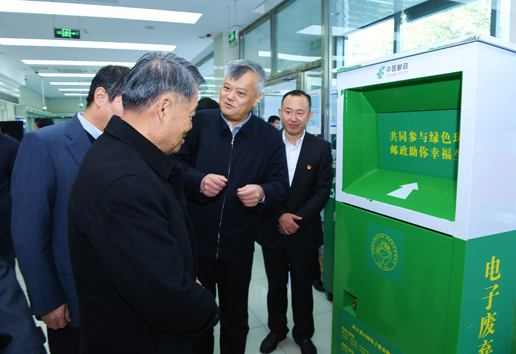 在百萬莊支局郵政營業前臺,楊傳堂認真察看全疊蓋免膠帶包裝箱的規格質量,詳細詢問免膠帶箱的使用方法以及綠色環保包裝箱和窄膠帶的應用情況,并在包裝廢棄物回收箱和電子廢棄物回收箱前了解郵政開展綠色回收工作情況。在郵政代理金融服務區,楊傳堂還了解了綠色金融的發展情況。