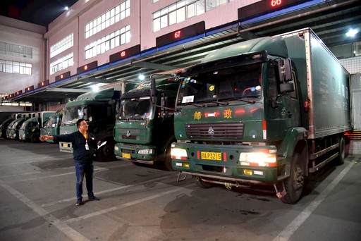 11月11日凌晨,湖北省武漢郵區中心局調度員楊成剛忙著指揮車輛進出垛口。 □郝振寧 攝影報道