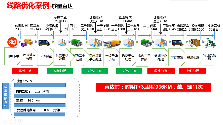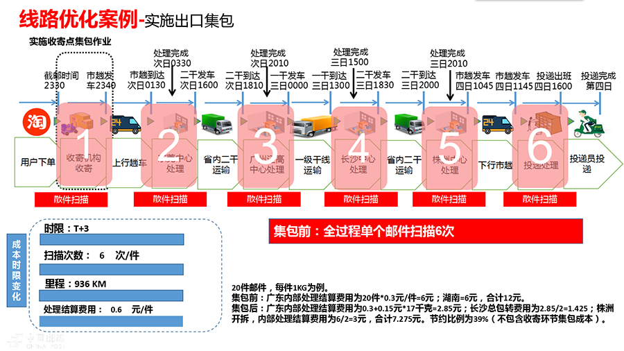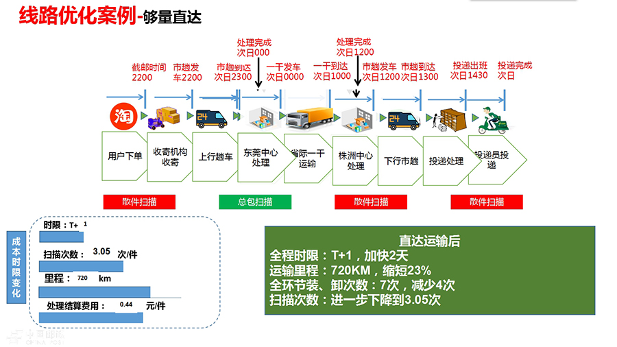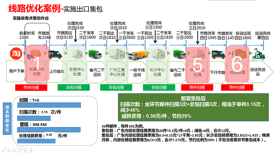 郵路要怎么捋?就是要以和競爭對手對標為任務,對每條線路從收寄到投遞進行全環節梳理、全鏈路優化。以廣東東莞—湖南株洲線路為例:這條線路目前日均包件量1000件,在全散件模式下,由于沒有直達郵路,郵件從收寄到投遞,每個郵件全程需經過6次散件分揀,11次散件裝卸搬運,時限T+3。通過全環節捋、全流程捋、各環節優化,改為在東莞實施前置集包,散件在收寄網點直接分揀封入株洲總包,同時開通東莞—株洲直達郵路,郵件由原來在東莞—廣州—長沙—株洲間散件裝卸,優化為東莞—株洲總包裝卸。通過這兩種優化措施的結合,郵件由散件分揀6次、裝卸搬運11次,將變為散件分揀3次、總包分撥3次、裝卸搬運7次,減少了廣州和長沙的4次總包裝卸作業,處理結算費用降低39%,裝卸效率大幅提升;時限水平由T+3將減少為T+1,達到次日遞,超過主要競爭對手;全程運輸里程從936公里將縮短為720公里,減少了23%,節約了運輸成本。此外,在該線路日均郵件量較少的情況下,可以采取組開深圳—東莞—株洲串行直達的運輸方式,在提高車輛裝載率的同時,實現當天收寄的東莞—株洲郵件和18點前收寄的深圳—株洲郵件全程時限T+1。