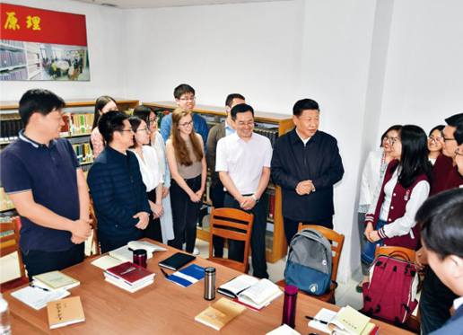 2018年5月2日,中共中央總書記、國家主席、中央軍委主席習近平來到北京大學考察。這是習近平在北京大學馬克思主義學院,與正在就“解讀新時代”進行座談交流的中外學生親切交談。 新華社記者 李濤/攝