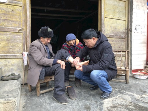 聽說(shuō)貧困戶胡洋朋腳扭傷后,陳澤維到他家看望。胡洋朋像看到自家人一樣伸出腳讓陳澤維查看傷勢(shì)。