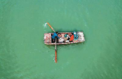 江蘇省淮安市洪澤區老子山鎮郵遞員唐真亞劃著小船和妻子閆玲前往新灘村送郵件。新華社記者 季春鵬攝