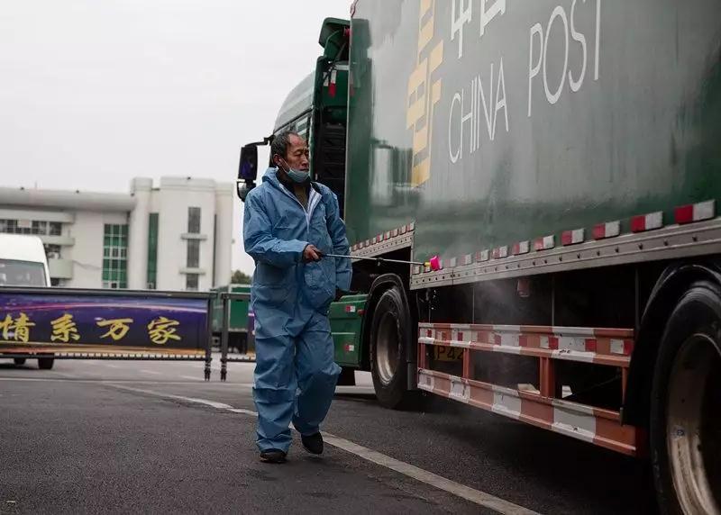 2月1日,武漢郵區中心局,工作人員噴灑稀釋的84消毒液為郵車消毒。來自全國各地經郵政系統送來的救援物資抵達中心局就意味著到達了武漢,從大年三十開始,有專人每天對進出車輛進行噴灑消毒。