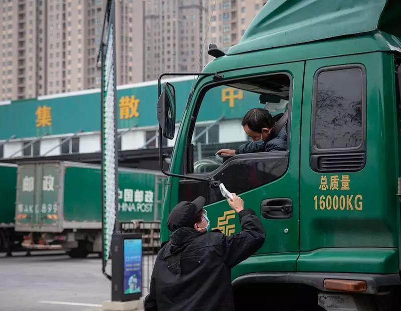 2月1日,武漢郵區中心局,工作人員為郵車司機測量體溫。