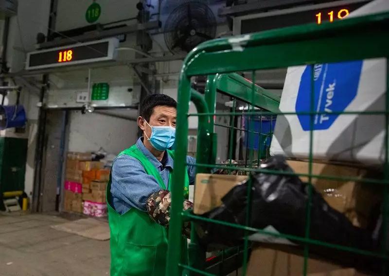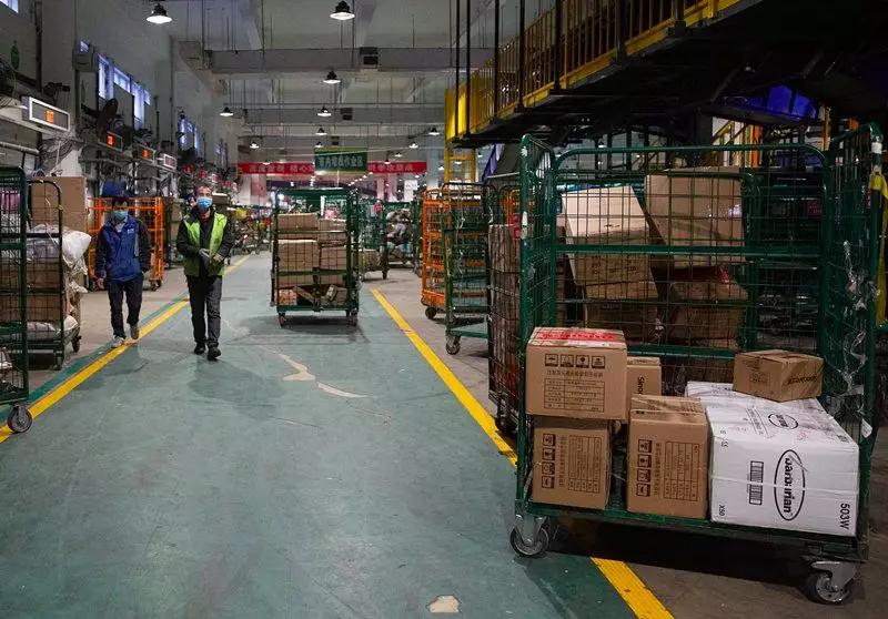 2月1日下午,武漢郵區中心局郵件處理中心,一名工作人員將一批捐贈燈具裝上郵車,準備第二天發往火神山醫院。當天,火神山醫院施工人員正不眠不休地趕工,確保在2月3日交付使用。