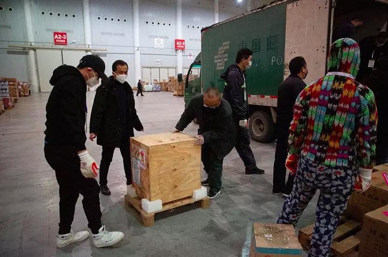 2月1日,武漢國際博覽中心,臨時被征用作倉庫的展廳內,現場志愿者和郵政工作人員從一輛中國郵政郵車上卸下一批來自杭州的醫療物資,其中包括PCR檢測系統等醫療設備。這里匯集了國內外援助物資,來自武漢各個投遞點的郵政工作人員常駐現場,協助對物資進行裝卸、分類和配送。