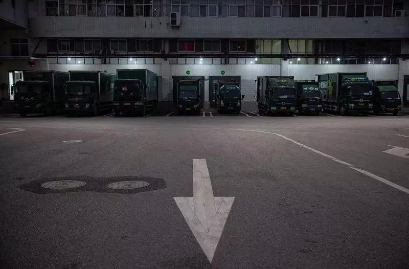 2月1日,武漢郵區中心局,負責市內運送的郵車整裝待發。疫情防控期間,這些郵車除了日常的收發郵件工作,其中一部分還承擔了將定點捐贈的物資送往醫院的任務。司機往醫院送貨時,需要穿戴防護服和口罩。