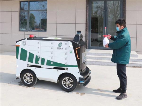 自正月初二起,無人投遞車——“漢馬”便開始忙碌運作起來,“漢馬”投遞車承擔起了仙桃市政府及直屬單位區域內的投遞任務。每天清晨,投遞員昌沁便早早的將需要妥投的郵件、報刊進行清分,攜帶至“智能郵局”站點,接下來,他并沒有立刻將郵件逐一放入投遞車格口,而是先拿出清潔酒精為“漢馬”來一次全身消毒,這是他近幾天以來,每天都要做的工作,早晚各一次,“這樣能夠徹底杜絕病毒的傳播,讓客戶放心使用無人車取郵件,也讓我們自己感到更加安心。”昌沁說。