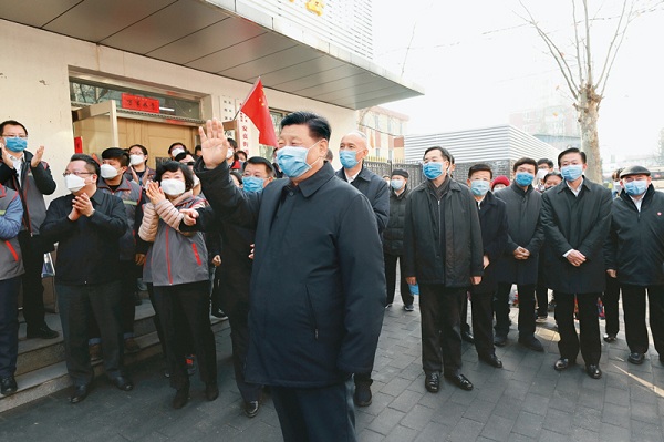 2020年2月10日,中共中央總書記、國家主席、中央軍委主席習近平在北京調研指導新冠肺炎疫情防控工作。這是習近平來到朝陽區安貞街道安華里社區,了解基層一線疫情聯防聯控情況。 新華社記者 鞠鵬/攝