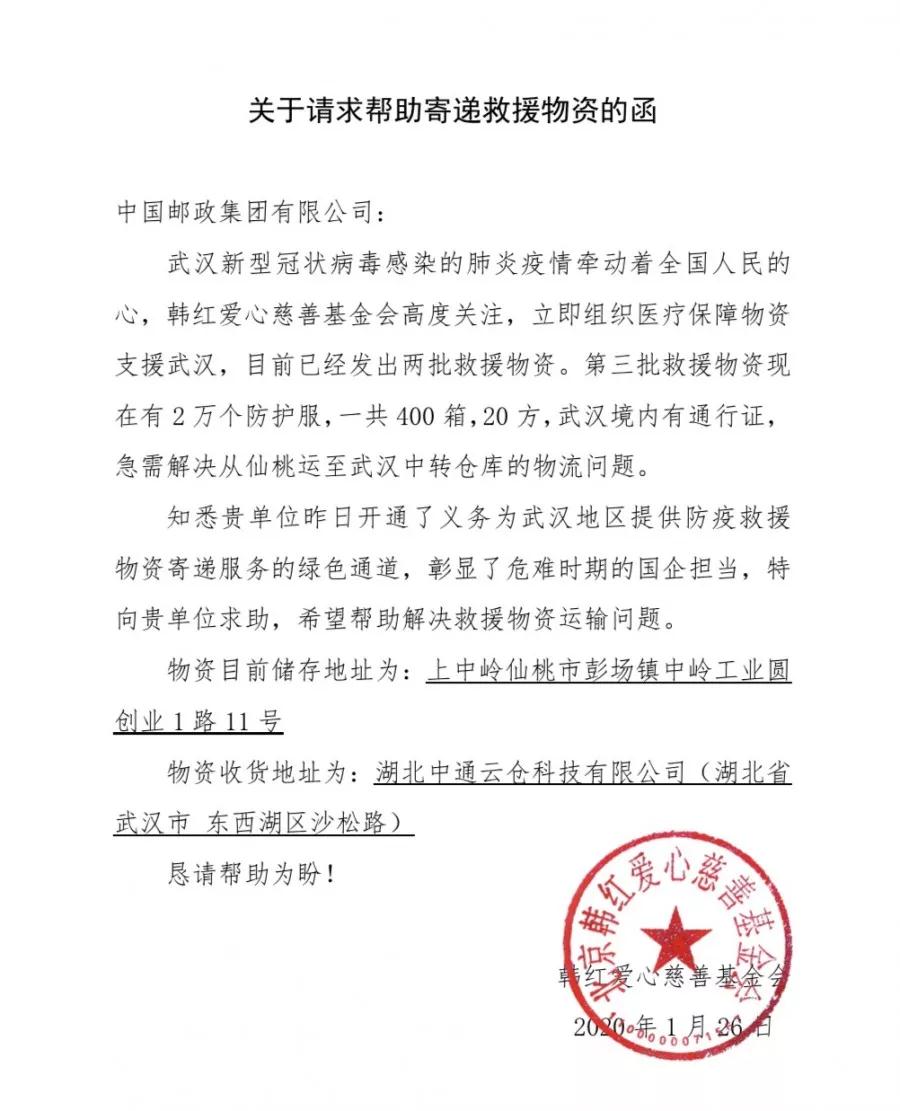 1月26日22時,湖北郵政收到由中國郵政集團有限公司轉發(fā),由北京韓紅愛心慈善基金會寄出的《關于請求幫助寄遞救援物資的函》。