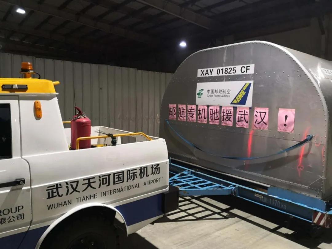 2月27日17時32分,中國郵政航空公司CF9121航班承載著總重1.618噸的16臺德國產ECMO設備及配套耗材從北京首都機場起飛,于19時16分在小雨中飛抵武漢天河機場,郵航武漢辦事處和天河機場地面保障部門第一時間展開卸機作業,完成這批救命設備的空陸交接。