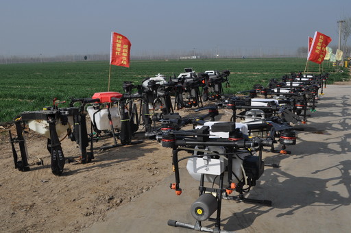 飛防作業(yè)前,11架無(wú)人機(jī)整齊排開,場(chǎng)面甚是壯觀。