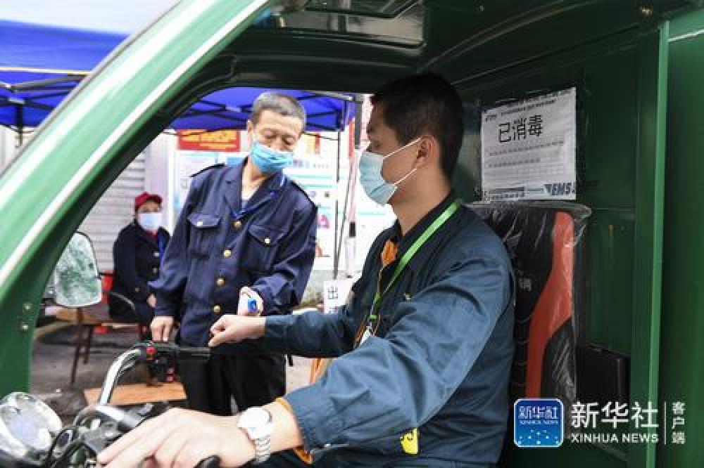 3月23日,廣西南寧郵政部門工作人員在進小區前配合工作人員測量體溫。