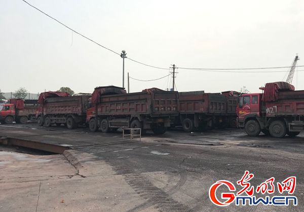 武漢港務(wù)陽邏港埠分公司工地上多輛裝載車等待運(yùn)輸煤渣(李政葳/攝)