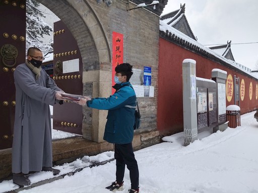 接下來,高健喻到了第二個投遞點——善財洞。由于疫情防控期間寺院實行封閉管理,到了寺院門口后,小高撥通客堂師父釋仁恒的電話,告知郵件來了。很快,釋仁恒打開厚重的寺門接過報紙說:“小高,這么大的雪你還過來了?每天看看你送來的報紙,了解天下大事,對我們也是一種很好的修行。”