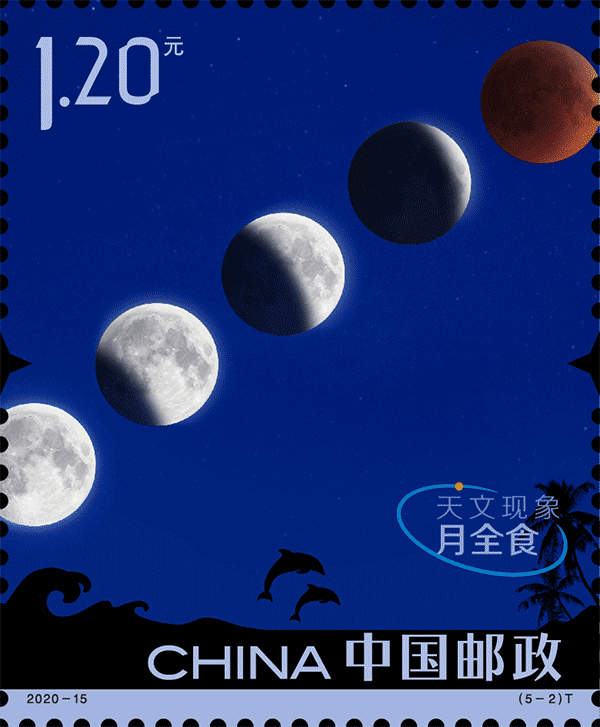 月全食郵票中,夜光墨的使用來(lái)表現(xiàn)滿月到月全食過(guò)程中不同亮度的月光效果。