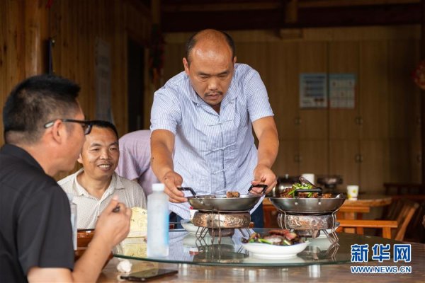 在湘西十八洞村,楊正邦(右)在給顧客上菜(6月30日攝)。 新華社記者 陳思汗 攝