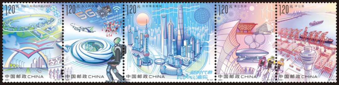 《新時代的浦東》是為紀念上海浦東開發(fā)開放30周年,由香港知名設(shè)計師韓秉華設(shè)計,中國郵政發(fā)行的一套5連票。這是繼1996年發(fā)行《上海浦東》郵票后,時隔25年再次發(fā)行的上海城市題材郵票。