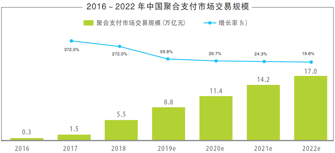根據艾瑞咨詢統計,2019年聚合支付市場交易規模約為8.8萬億元,同比增長59.8%,預計未來該市場的增速將有所回落,但仍能保持較穩定的增長。