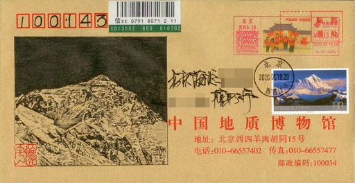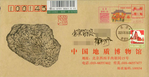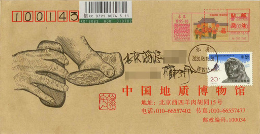 燧石俗稱“火石”,是一種含硅、質密堅硬的巖石,破碎后形成鋒利的斷口,對敲產生火星,能夠引燃干草木。相傳,燧石取火法是燧人氏發明的,這種更簡易的取火方式讓人類得以真正控制火種、掙脫黑暗的束縛。在這枚“燧石取火”手繪封上,我加貼了“北京猿人”郵票,雖然他們已經離我們遠去,但火種將我們聯系在了一起,作為“晚期智人”的后代,我向他們致以問候。