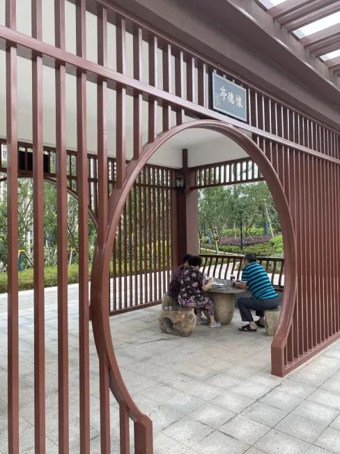 吃過早飯,記者來到位于兩江新區的禮仁公園。公園里栽種著錯落有致的樹木和草坪,形成了漂亮的立體景觀,休閑亭臺、健身設施、多功能步道坐落其間,已經聚集了不少三五成群的居民在散步休閑。