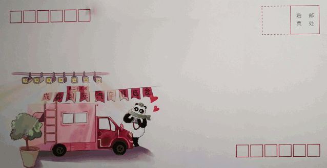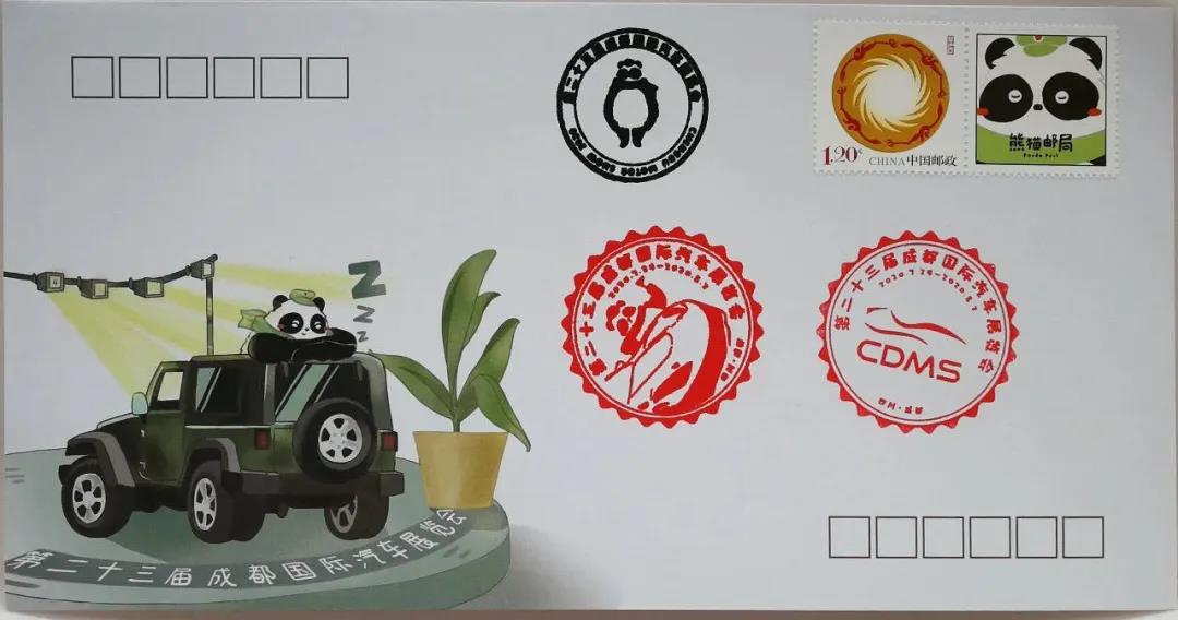 郵戳部分結合成都國際車展標志設計,選用流線型超跑元素結合熊貓郵局IP形象,豐富視覺表現,外觀更是采用圓形鋸齒輪廓,區別于傳統郵戳形態,給人耳目一新的感覺。