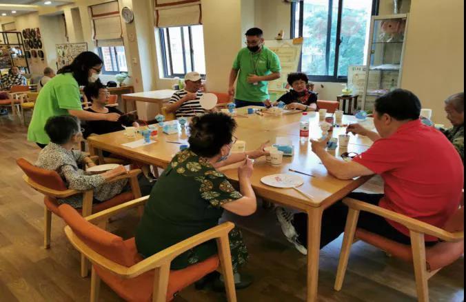 在三樓長樂日間照料中心,專職社工正在教老人們繪畫填色。侯亞景 攝