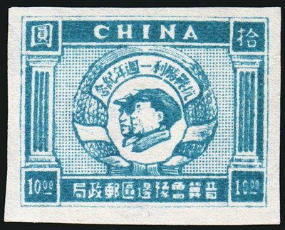 2.抗戰(zhàn)勝利后,各根據(jù)地陸續(xù)發(fā)行了抗戰(zhàn)勝利紀(jì)念郵票。晉察冀邊區(qū)于1945年到1946年發(fā)行的該題材郵票主圖為“八路健兒疆場殺敵圖”,并且以此圖案發(fā)行過兩次郵票,根據(jù)票幅大小不同分別稱作“抗戰(zhàn)勝利紀(jì)念大型郵票”(俗稱“大抗戰(zhàn)”)和“抗戰(zhàn)勝利紀(jì)念小型郵票”(俗稱“小抗戰(zhàn)”)。晉冀魯豫邊區(qū)分別于1947年3月和7月發(fā)行了“抗戰(zhàn)勝利一周年紀(jì)念郵票”和“抗戰(zhàn)勝利二周年紀(jì)念郵票”,兩套郵票主圖相同,顏色不同,均為毛澤東主席和朱德總司令的側(cè)面像,這是抗戰(zhàn)期間指揮邊區(qū)軍民抗擊日寇的兩位領(lǐng)袖。東北區(qū)1947年發(fā)行了三種紀(jì)念抗戰(zhàn)的郵票,7月7日發(fā)行的“七七”抗戰(zhàn)十周年紀(jì)念郵票及小全張,主圖為一只有力的手臂緊握一支步槍,表示面對敵人的侵略,全民抗戰(zhàn)的決心;8月15日發(fā)行的“八一五”東北解放二周年紀(jì)念郵票,主圖為陽光照射下的白山黑水,兩側(cè)為大豆、高粱,表現(xiàn)解放后的東北豐衣足食,生活美好;9月18日發(fā)行的“九一八”紀(jì)念郵票,主圖為東三省地圖,兩側(cè)分別為“反對美蔣反動派制造二次滿洲國”的文字,在紀(jì)念“九一八”事變的同時(shí),也宣傳了當(dāng)時(shí)的斗爭形式。山東區(qū)發(fā)行的“抗日民族戰(zhàn)爭勝利紀(jì)念郵票”,主圖是毛澤東揮手指引人民奔向光明的前程,表示勝利后,人民希望建立一個(gè)富強(qiáng)民主的新中國的美好愿望。東北區(qū)還于1949年8月15日發(fā)行了“八一五”四周年紀(jì)念郵票,主圖為東北抗日暨愛國自衛(wèi)戰(zhàn)爭烈士紀(jì)念塔。1946年12月,山東區(qū)發(fā)行了“膠東抗日烈士紀(jì)念塔圖郵票”,主圖為紀(jì)念塔,緬懷膠東抗戰(zhàn)中犧牲的烈士。