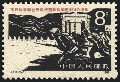 3.新中國成立后發(fā)行的抗戰(zhàn)紀(jì)念郵票,郵票主圖取材廣泛,圖案名稱多用抗戰(zhàn)史實(shí)名稱來命名。1952年7月7日發(fā)行的紀(jì)16“抗日戰(zhàn)爭十五周年紀(jì)念”郵票,分別為“盧溝橋風(fēng)云”“平型關(guān)勝利”“歡送新四軍抗日”“領(lǐng)袖策劃反攻”,4枚郵票圖案定格抗戰(zhàn)中4個(gè)有代表性的場景。1965年9月3日發(fā)行的紀(jì)115“紀(jì)念抗日戰(zhàn)爭勝利二十周年”郵票,1套4枚,“毛主席在著作”一圖描繪了毛澤東在延安窯洞里寫作《論持久戰(zhàn)》的情景;“八路軍東渡黃河”郵票圖案為八路軍戰(zhàn)士在黃河邊準(zhǔn)備東渡,奔赴抗日戰(zhàn)爭前線的場面;“人民戰(zhàn)爭勝利”主圖為取得抗日戰(zhàn)爭勝利的八路軍、新四軍和游擊隊(duì)?wèi)?zhàn)士在歡呼勝利的場景;“光榮參軍”主圖為人民群眾積極參加人民軍隊(duì),加入抗戰(zhàn)隊(duì)伍的情景。1985年9月3日發(fā)行的J.117“抗日戰(zhàn)爭和世界反法西斯戰(zhàn)爭勝利40周年”郵票,1套2枚,“盧溝橋中國軍隊(duì)奮起抗日”描繪了抗日戰(zhàn)爭中國民黨二十九軍將士沖鋒陷陣、奮勇抗戰(zhàn)的英雄形象;“八路軍和民兵戰(zhàn)斗在長城內(nèi)外”展現(xiàn)了八路軍配合民兵浴血奮戰(zhàn),共同打擊日寇的光輝形象。1995年9月3日發(fā)行的“抗日戰(zhàn)爭和世界反法西斯戰(zhàn)爭勝利五十周年”郵票,1套8枚,分別為“戰(zhàn)火”“臺兒莊大捷”“百團(tuán)大戰(zhàn)”“敵后游擊戰(zhàn)”“芒友會師”“華僑捐獻(xiàn)”“臺灣光復(fù)”“偉大勝利”。分別描繪了盧溝橋戰(zhàn)斗、臺兒莊大捷、百團(tuán)大戰(zhàn)、敵后游擊戰(zhàn)、芒友會師的場景,以及華僑捐獻(xiàn)、歡慶臺灣光復(fù)、日本正式投降簽字儀式的勝利場面。2005年8月15日發(fā)行的“中國人民抗日戰(zhàn)爭暨世界反法西斯戰(zhàn)爭勝利六十周年”郵票,1套4枚及1枚小型張,“全民抗戰(zhàn)”展現(xiàn)的是國共兩黨軍隊(duì)和人民群眾并肩作戰(zhàn)的場面;“中流砥柱”主圖為一名八路軍戰(zhàn)士吹響沖鋒號,展現(xiàn)了八路軍在抗戰(zhàn)中的重要作用;“諾曼底登陸”主圖為登陸后手持步槍的美軍士兵;“攻克柏林”主圖為蘇軍歡呼勝利的場景;小型張主圖為一只沖破鐵絲網(wǎng)的白色和平鴿,寓意和平與正義沖破了戰(zhàn)爭的主題。2015年9月3日發(fā)行的“中國人民抗日戰(zhàn)爭暨世界反法西斯戰(zhàn)爭勝利七十周年”郵票,1套13枚及1枚小型張,郵票圖案背景表現(xiàn)的是中國抗戰(zhàn)中的13個(gè)經(jīng)典事件場面,主圖是與該事件相關(guān)的紀(jì)念場館:“九一八”歷史博物館、東北烈士紀(jì)念館、中國人民抗日戰(zhàn)爭紀(jì)念館、上海淞滬抗戰(zhàn)紀(jì)念館、侵華日軍南京大屠殺遇難同胞紀(jì)念館、臺兒莊大戰(zhàn)紀(jì)念館、延安革命紀(jì)念館、八路軍總部舊址紀(jì)念館、百團(tuán)大戰(zhàn)紀(jì)念館、平型關(guān)大捷紀(jì)念館、冉莊地道戰(zhàn)紀(jì)念館、新四軍紀(jì)念館、滇西抗戰(zhàn)紀(jì)念館;小型張畫面以《大刀進(jìn)行曲》雕塑為主圖,高度概括、反映了全民抗戰(zhàn)的主題。
